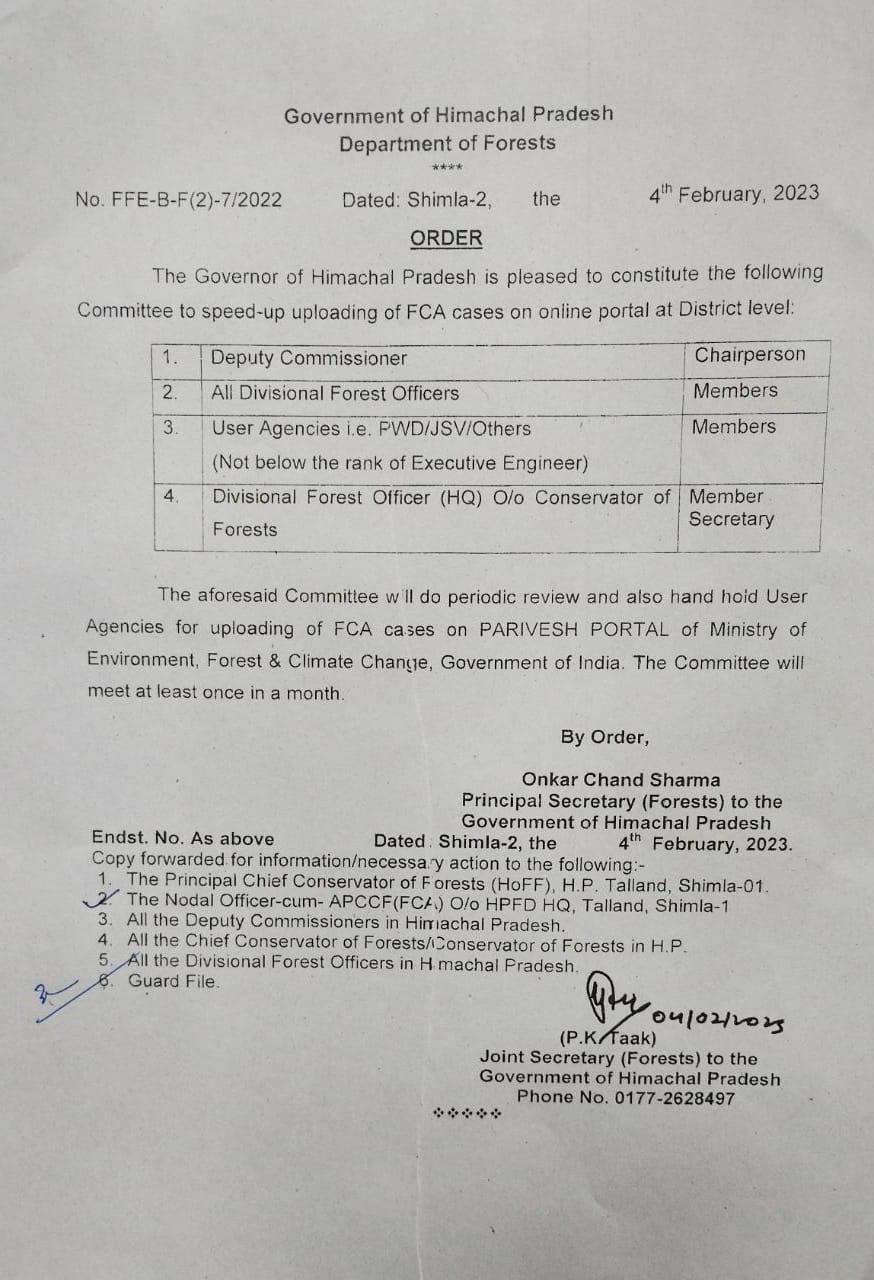- HP Notification to reconstitute the Executive Committee of Himachal Pradesh Forest Eco System Climate Proofing (KFW) project to review the progress on the project.