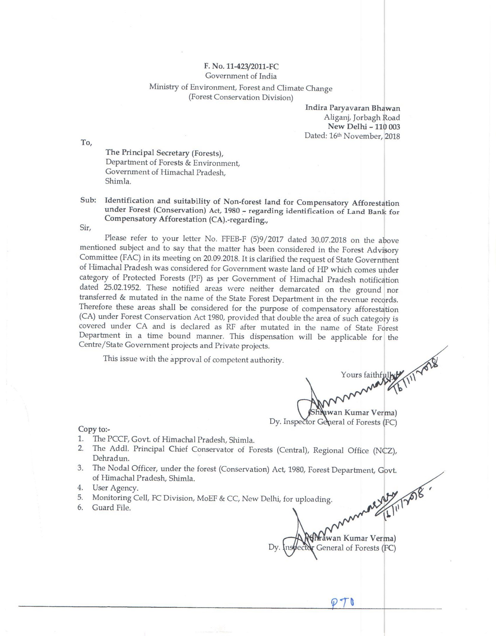 - Identification & suitability of Non-Forest Land for Compensatory Afforestation under Forest Conservation Act 1980-Guidelines dated 16.11.2018