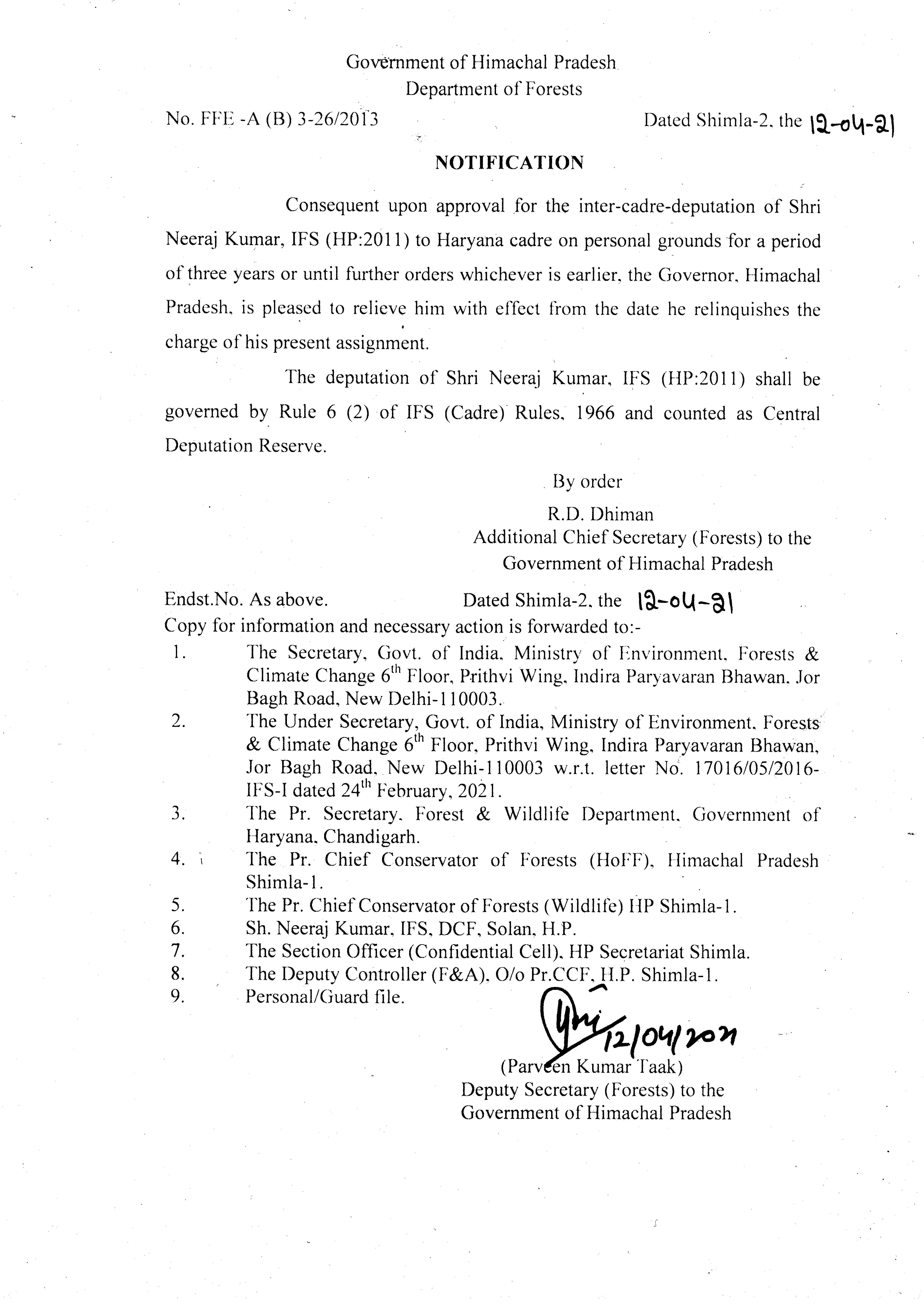 - Notification regarding inter-cadre-deputation of Shri Neeraj Kumar, IFS (HP:2011).